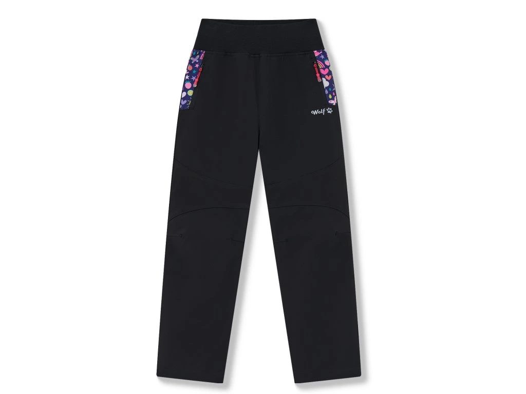Schwarze, unisolierte Softshell-Hosen für Mädchen sind wasserdicht, winddicht und luftdicht. Breiter, elastischer Baumwollbund, perforiertes Innenfutter. Zwei Reißverschlusstaschen vorne mit Print und Reflektoren.