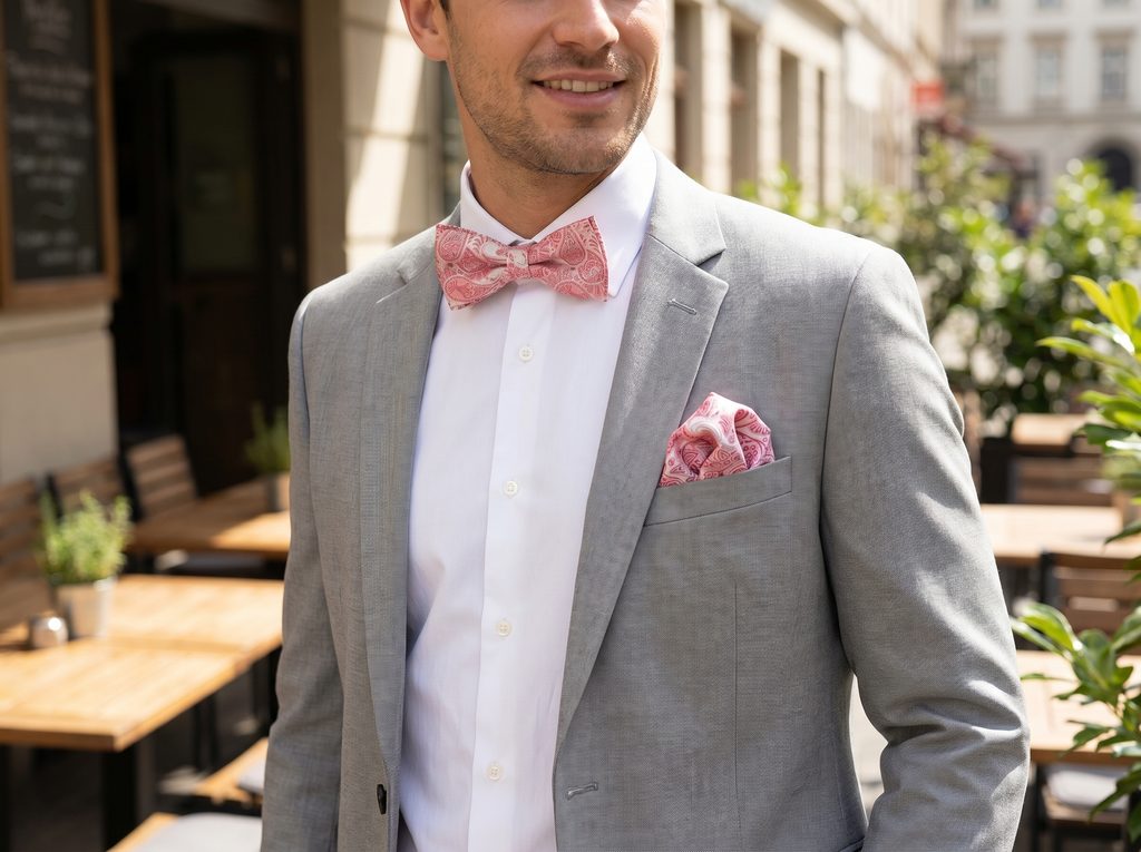 Ein lebendiger Rosaton kombiniert mit feinem Paisley bringt Frische in das Outfit und setzt einen klaren Akzent. Die Wirkung bleibt ausgewogen, sodass sich die Fliege gut für Hochzeiten und festliche Anlässe eignet, bei denen ein wenig Farbe erwünscht ist.