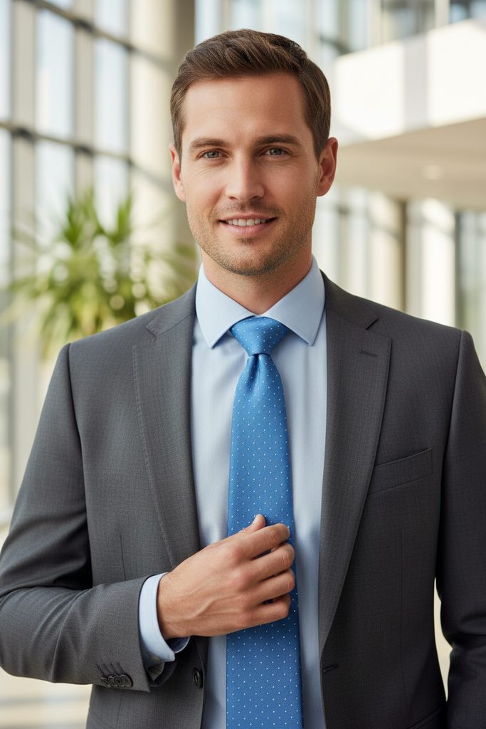 Die himmelblaue Krawatte mit weißen Strichen ist 7 cm breit und aus Polyester. Als Ergänzung zu einem hellen Hemd wirkt eine Krawatte sehr elegant.