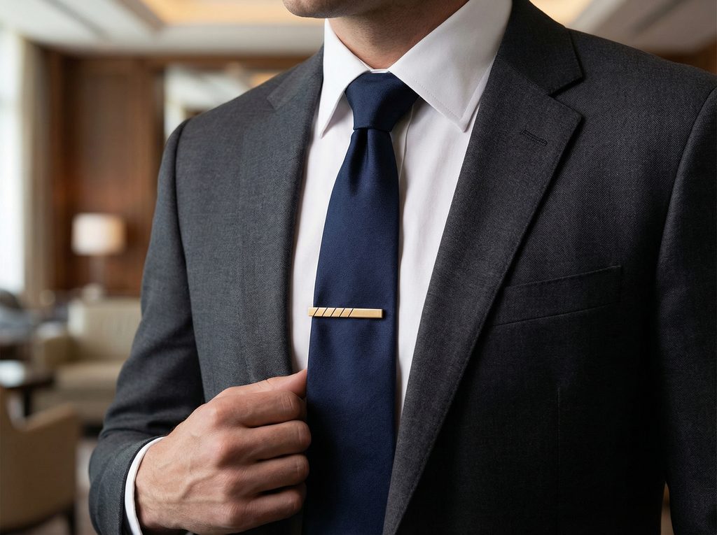 Eleganz und Funktionalität vereinen sich in unserer goldenen Premium-Krawattenklammer, die das ideale Accessoire für jeden modernen Mann ist. Dieses stilvolle Stück besticht durch sein Goldfinish mit schwarzen Linien, die der Schnalle ein unverwechselbares und anspruchsvolles Aussehen verleihen. Die Krawattenklammer hält Ihre Krawatte nicht nur fest an ihrem Platz, sondern verleiht Ihrem Outfit auch einen Hauch von Stil.