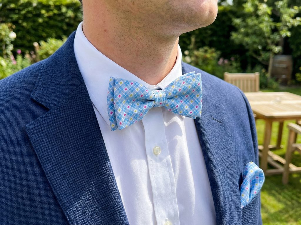 Ein hellblauer Grundton in Kombination mit einem bunten Muster wirkt frisch und lebendig. Die Fliege lockert klassische Outfits auf und eignet sich besonders für Anlässe, bei denen ein etwas entspannterer Stil gefragt ist.