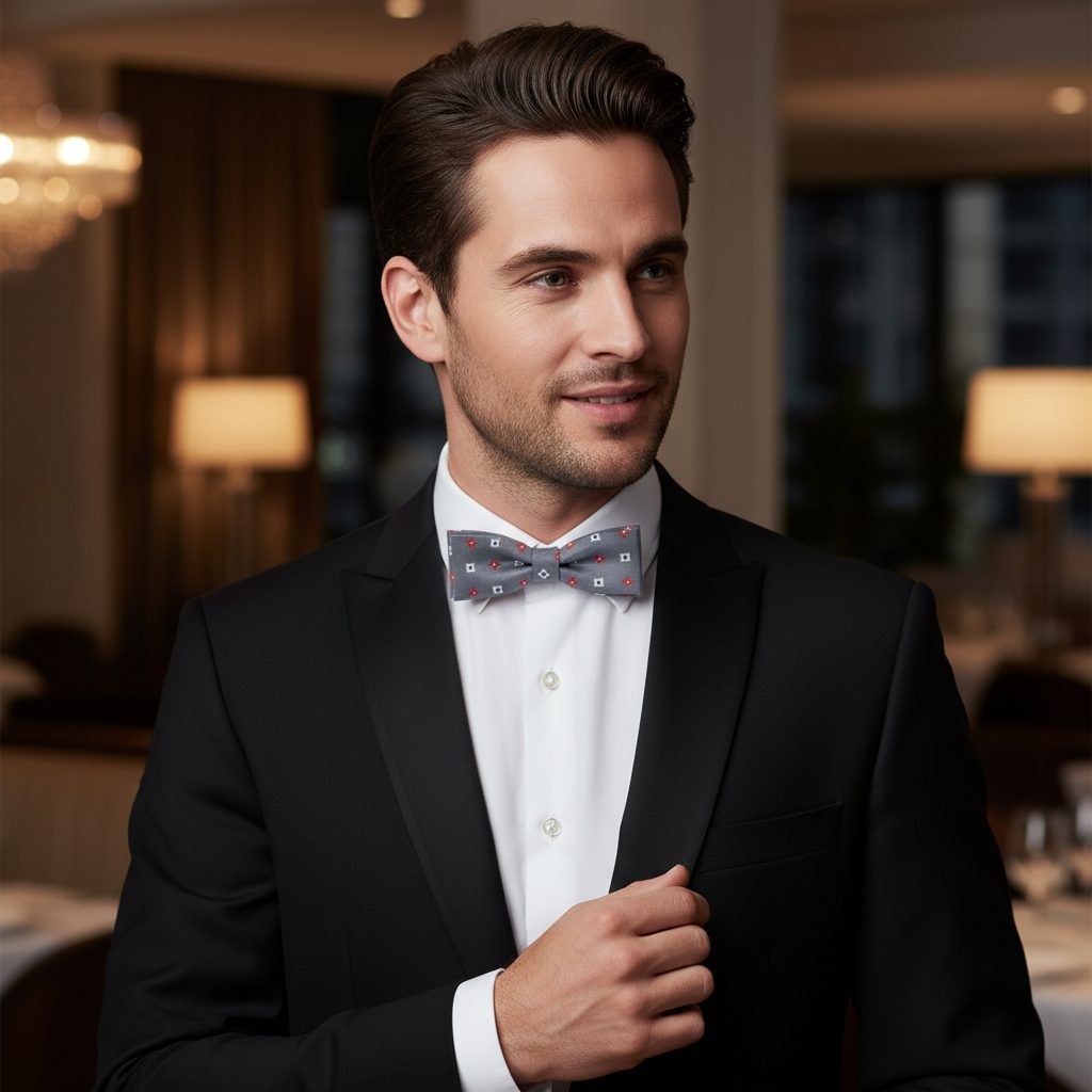 Graue Fliege rote weiße Blumen 10 cm passt perfekt zu allen Frack- oder Smoking-Hemden. An der Rückseite der Fliege ist einen Haken mit einer Öse befestigt, dank dessen die Länge nach Umfang Ihres Halses reguliert werden kann.