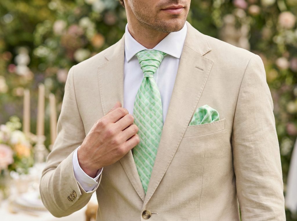 • Frischer Hellgrünton • Dezente Struktur • Vorgefertigte Form • Verstellbar • Einstecktuch inklusive