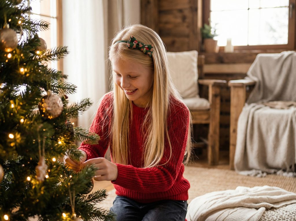 Manche Accessoires sorgen nicht nur für einen stilvollen Look, sondern auch für die richtige Stimmung. Dieser grüne Haarreif mit Weihnachtsmotiv verleiht dem Outfit eine leichte, festliche Note und passt genau zu Momenten, in denen es um Atmosphäre geht.