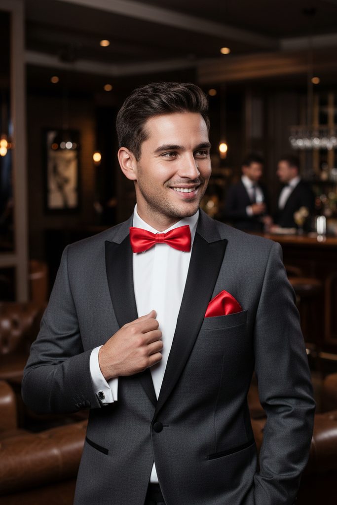 Herren Fliege mit Einstecktuch in Rotfarbe 12,5 cm passt perfekt zu allen Frack- oder Smoking-Hemden. An der Rückseite der Fliege ist einen Haken mit einer Öse befestigt, dank dessen die Länge nach Umfang Ihres Halses reguliert werden kann.