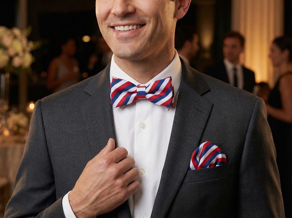 Drei Farben in einer klaren Kombination verleihen dem Outfit sofort mehr Ausdruck. Die Trikolore-Fliege wirkt lebendig und setzt einen sichtbaren Akzent, ohne unruhig zu erscheinen.