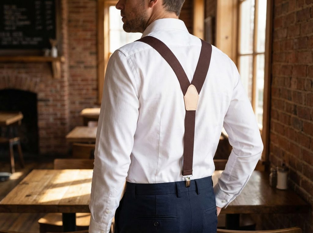 Braune Hosenträger mit beigem Leder lassen sich gut mit einem weißen Hemd, einem dunklen Sakko oder Hosen in Grau- oder Beigetönen kombinieren. Die Kombination aus Braun und Beige wirkt natürlich und passt zu vielen klassischen Looks.