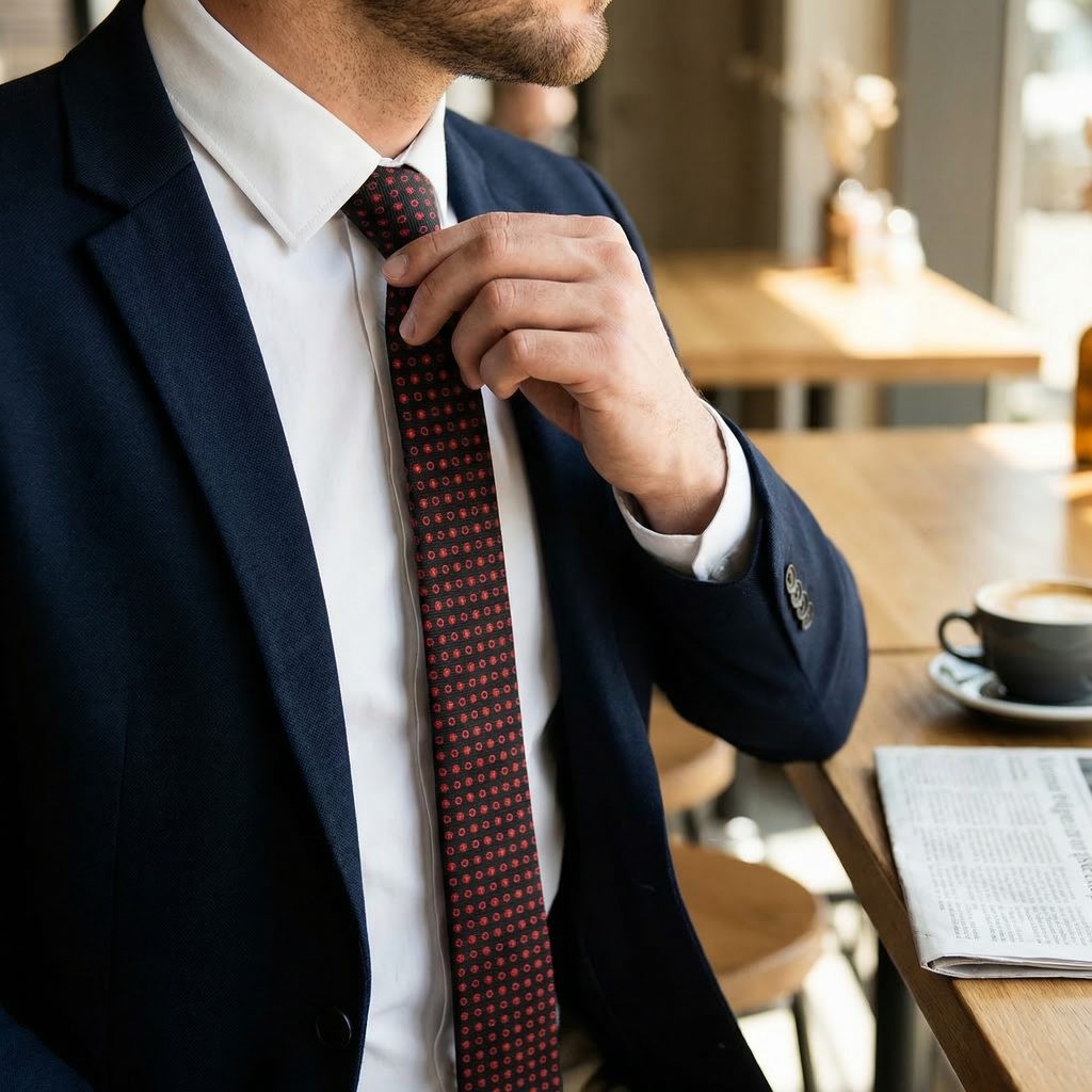 Der Stoff mit dezentem Glanz lässt die Farben klar hervortreten und verleiht der Krawatte einen gepflegten Eindruck. Durch den schmalen Schnitt passt sie hervorragend zu modernen Anzügen und Hemden mit schmalerem Kragen. Solche Muster bringen Abwechslung in einen klassischen Look und geben dem Outfit einen kleinen, aber wirkungsvollen Akzent.