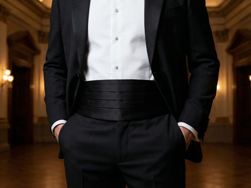 Schwarz gilt als zeitlose Wahl für formelle Anlässe. Der Bund ersetzt die Weste beim Smoking und unterstreicht die präzise Linie der Abendgarderobe.